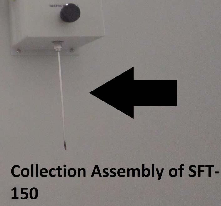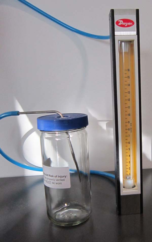 Use one piece of flexible tubing to connect the blunt end of the “L” shaped metal tube to the bottom of the flow meter.  Use the other piece of flexible tubing to vent or hood (if desired)