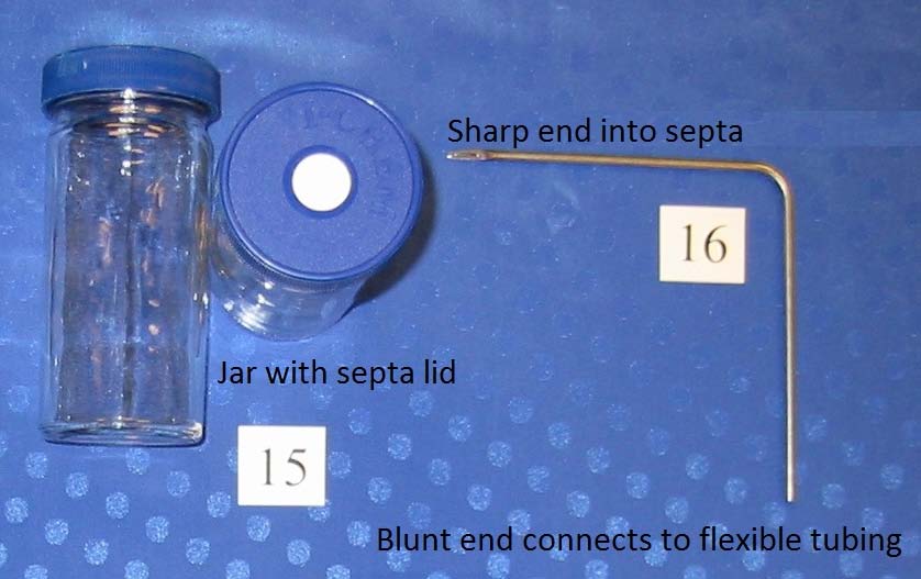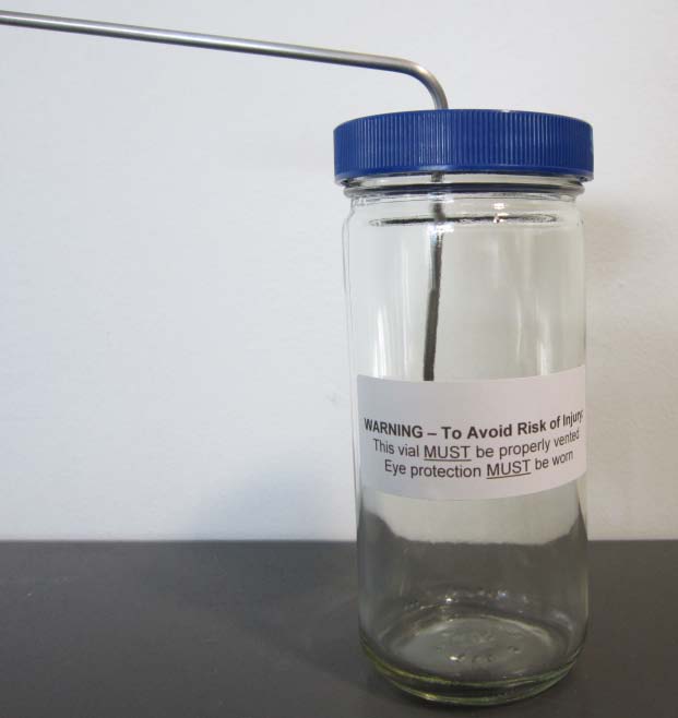 Insert sharp end of “L” shaped tube into jar (or vial) with septa lid.  Slide the septa jar (with the “L” shaped metal tube) into the collection assembly of the SFE outlet (see below).